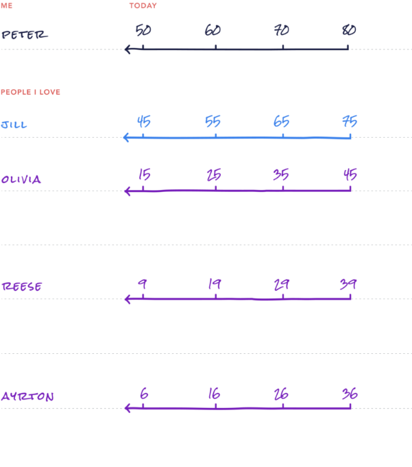Throughout this exercise, I have included my own information as examples to illustrate the concepts, but I invite you to make this your own. Start by writing your name in the space labeled “Me.” Then, write your current age on the first dash. On each of the subsequent dashes, write the age you’ll be every 10 years, until you reach the age of average life expectancy—this is roughly 80 years for a healthy adult in the U.S. To finish, draw a line from today until 80.