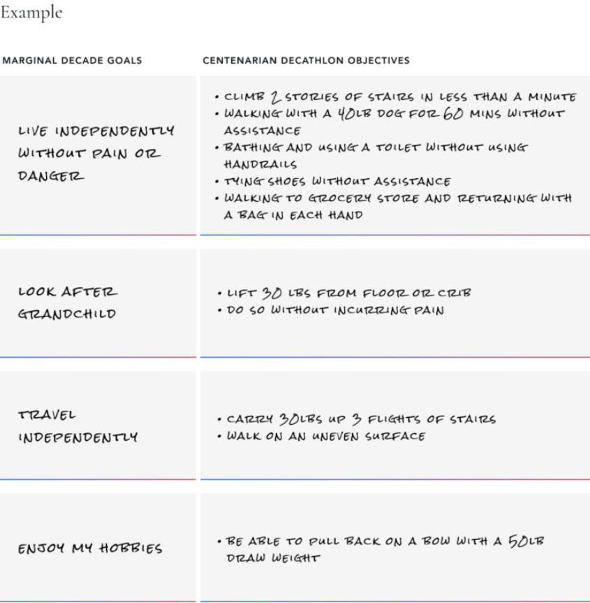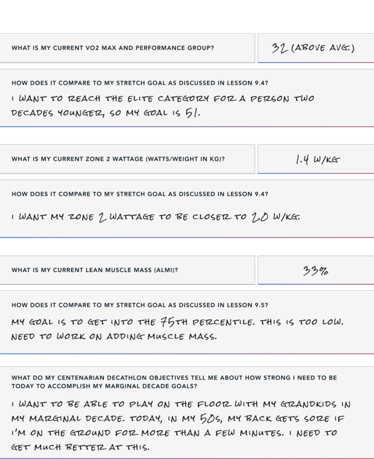 Complete your exercise framework by answering the questions and recording your answers under Step 1: Assess on the worksheet. For the first page of the exercise worksheet, find your Marginal Decade goals from Module 1, and develop a set of Centenarian Decathlon Objectives for each.