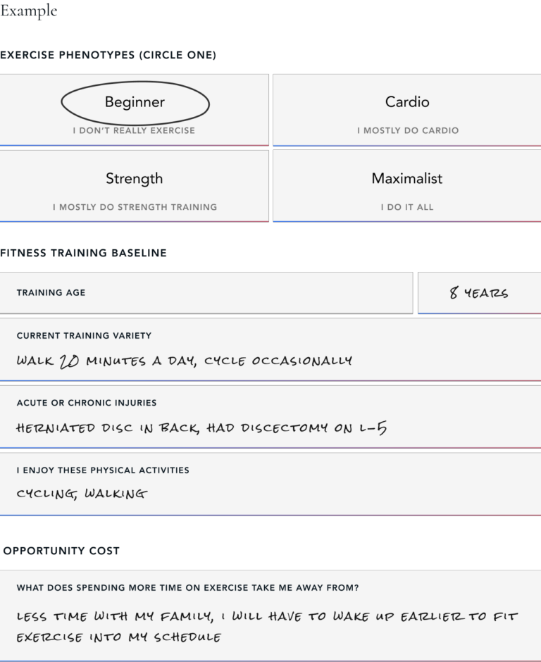 On the second page of the exercise worksheet, answer the following questions to figure out your exercise phenotype, fitness training baseline, and opportunity cost.