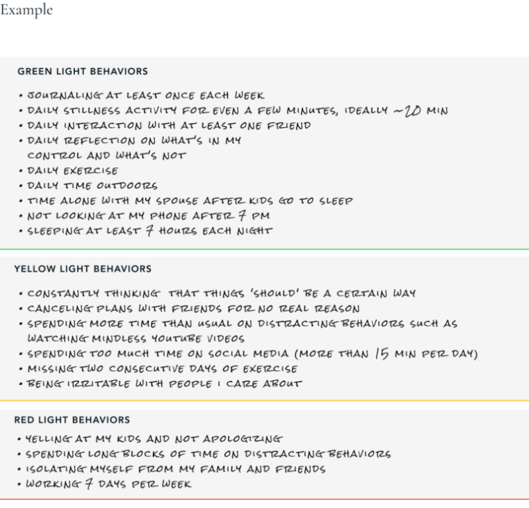 Yellow light: Behaviors that show up before red light behaviors. It’s easy to miss these, as they are often seemingly benign. We want to get better at catching these behaviors before we tumble further into distress so we can take corrective steps.